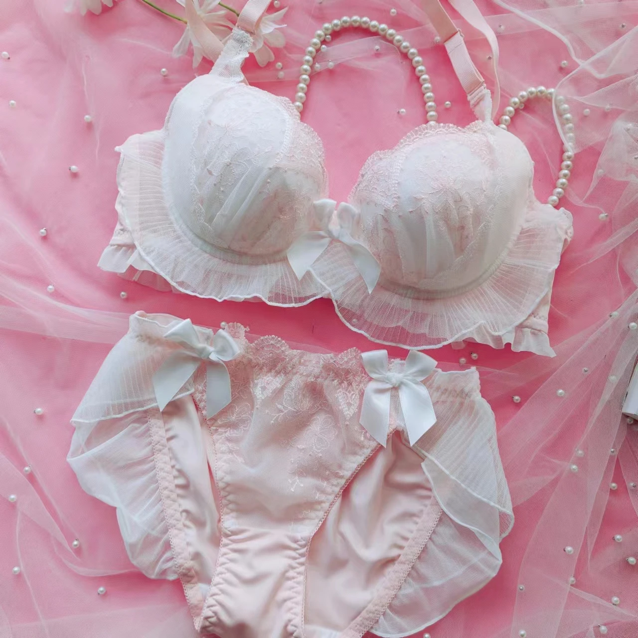 Printed chiffon thin college style underwear girls sweet cute lingerie three buckle push up embroidery female bra set