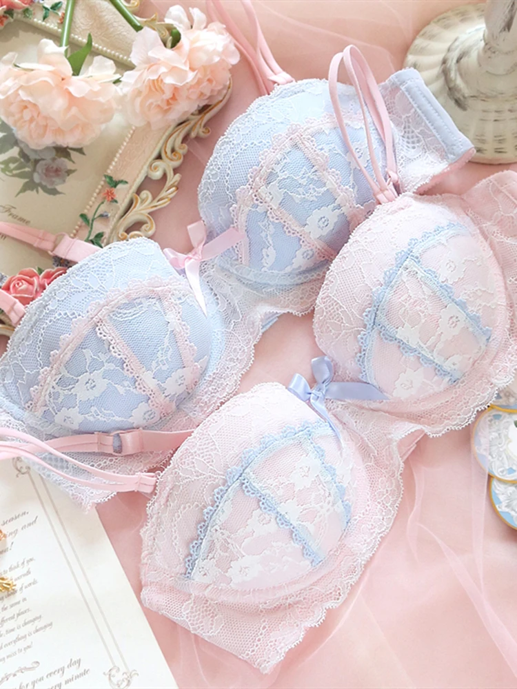 Underwear sweet and cute lace lingerie with briefs set girl heart fresh steel ring gathered thin bra set large size bralette